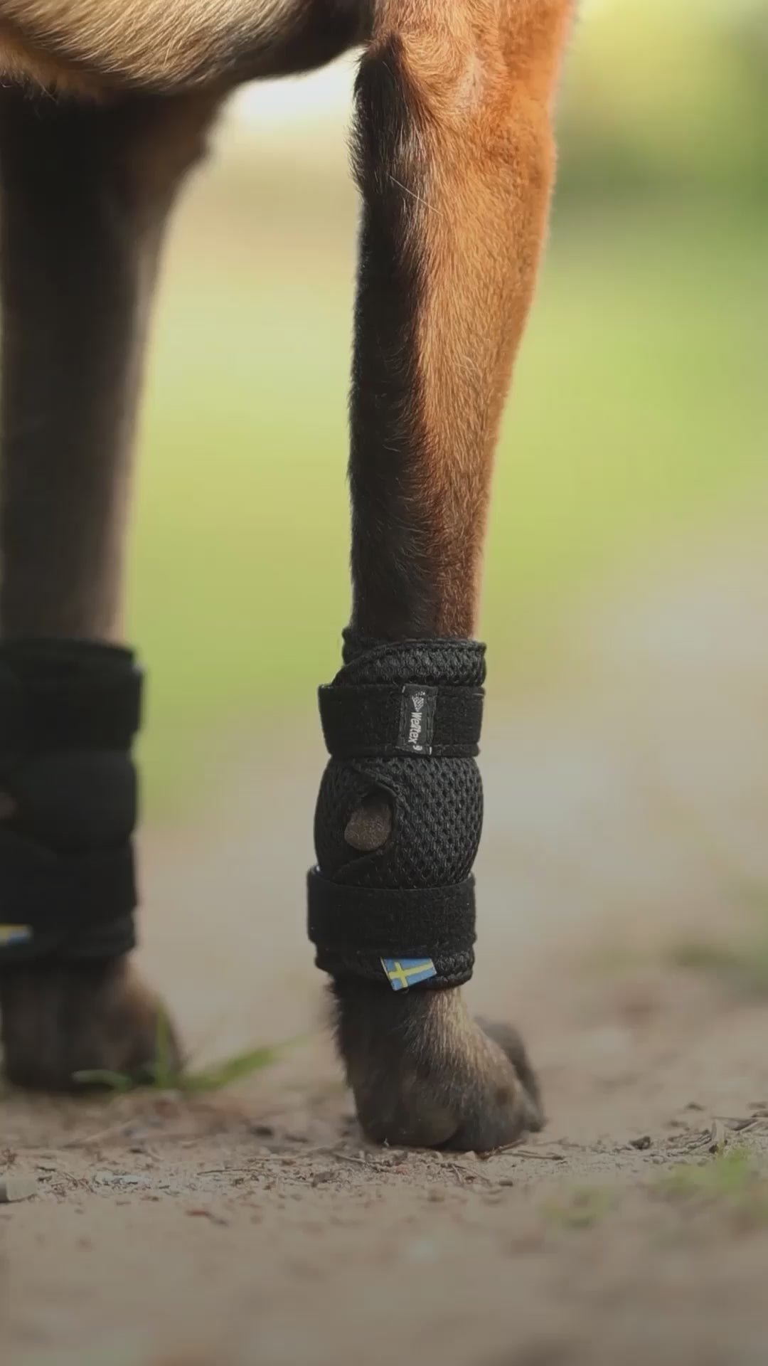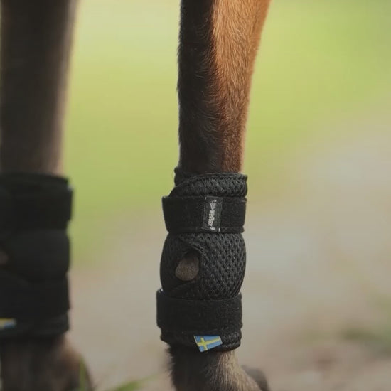 Skydden är justerbara för en optimal passform på hundens ben och fästs enkelt med dubbelsidigt kardborreband. En öppning över hasspetsen ger ökad rörelseförmåga och flexibilitet. Luftig 3D mesh ger extra god andningsförmåga och säkerställer hög komfort.