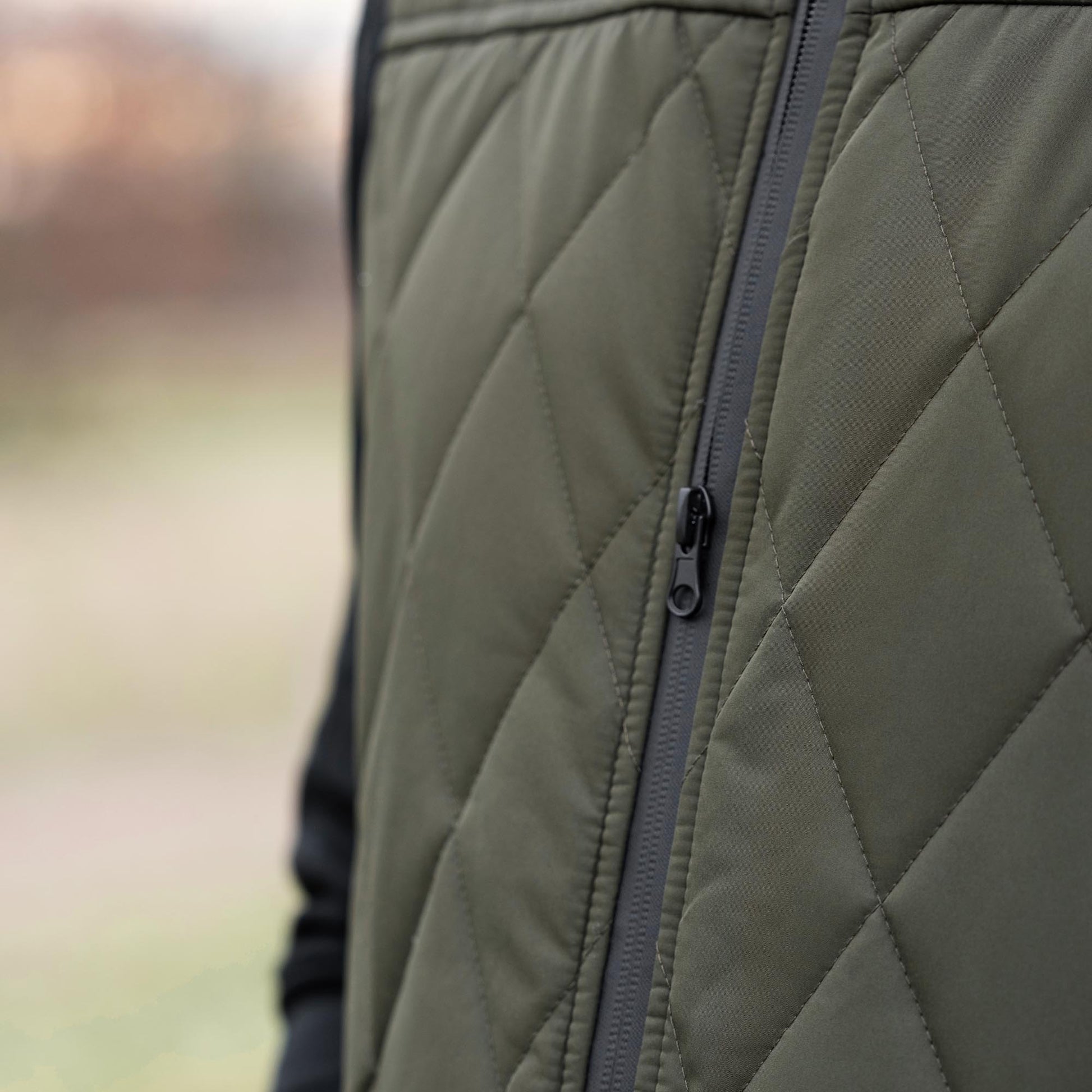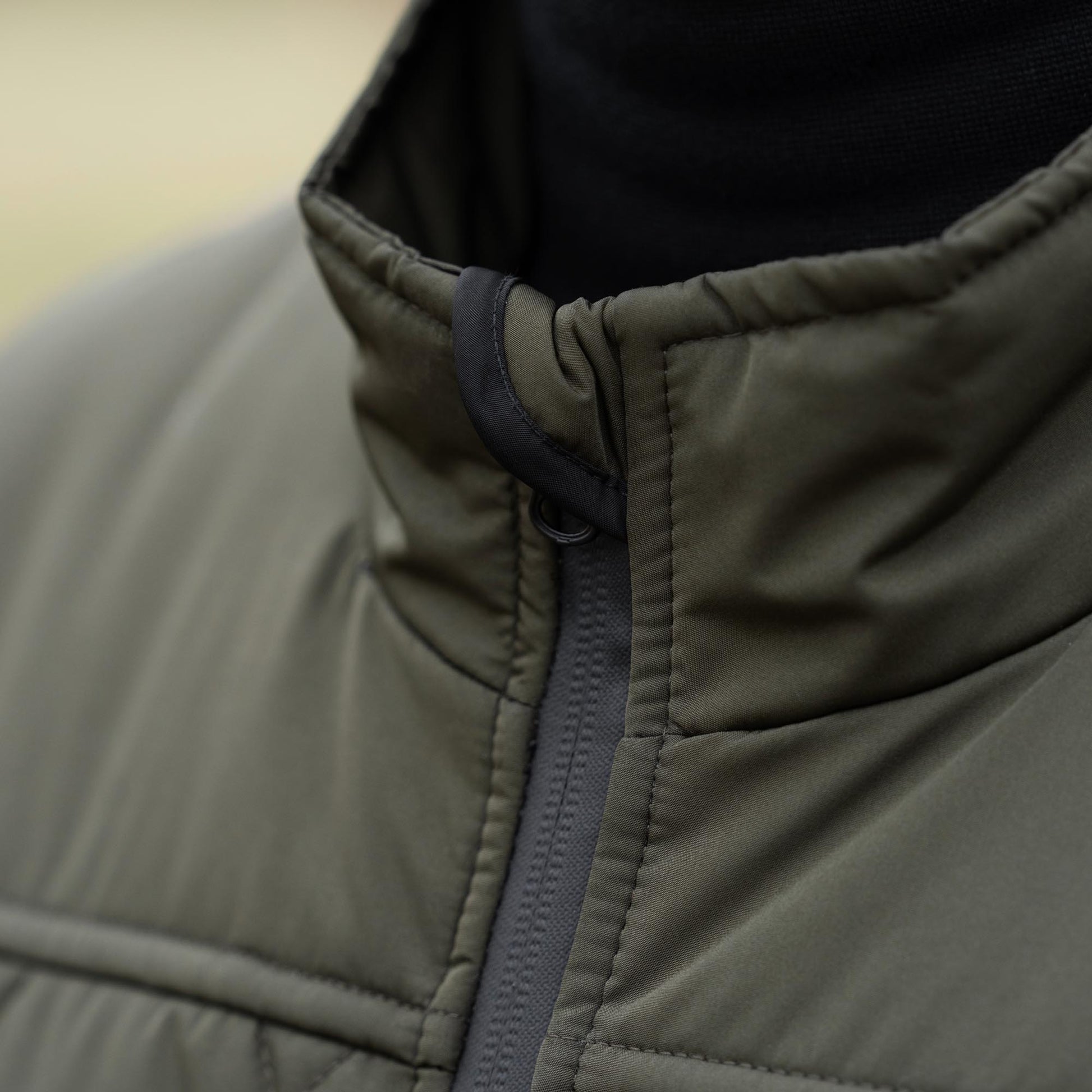 Västen är mättat olivgrön med svarta blixtlås.