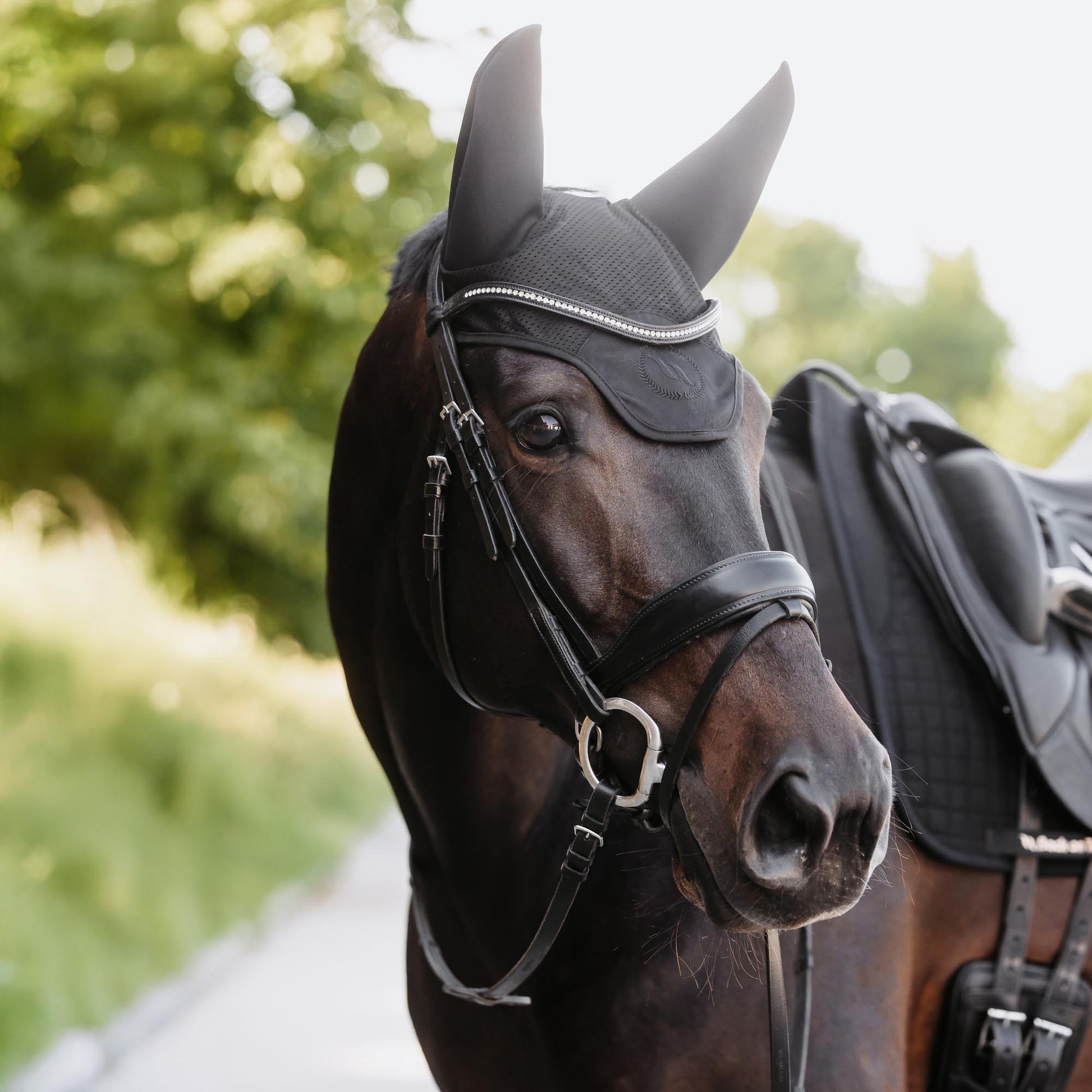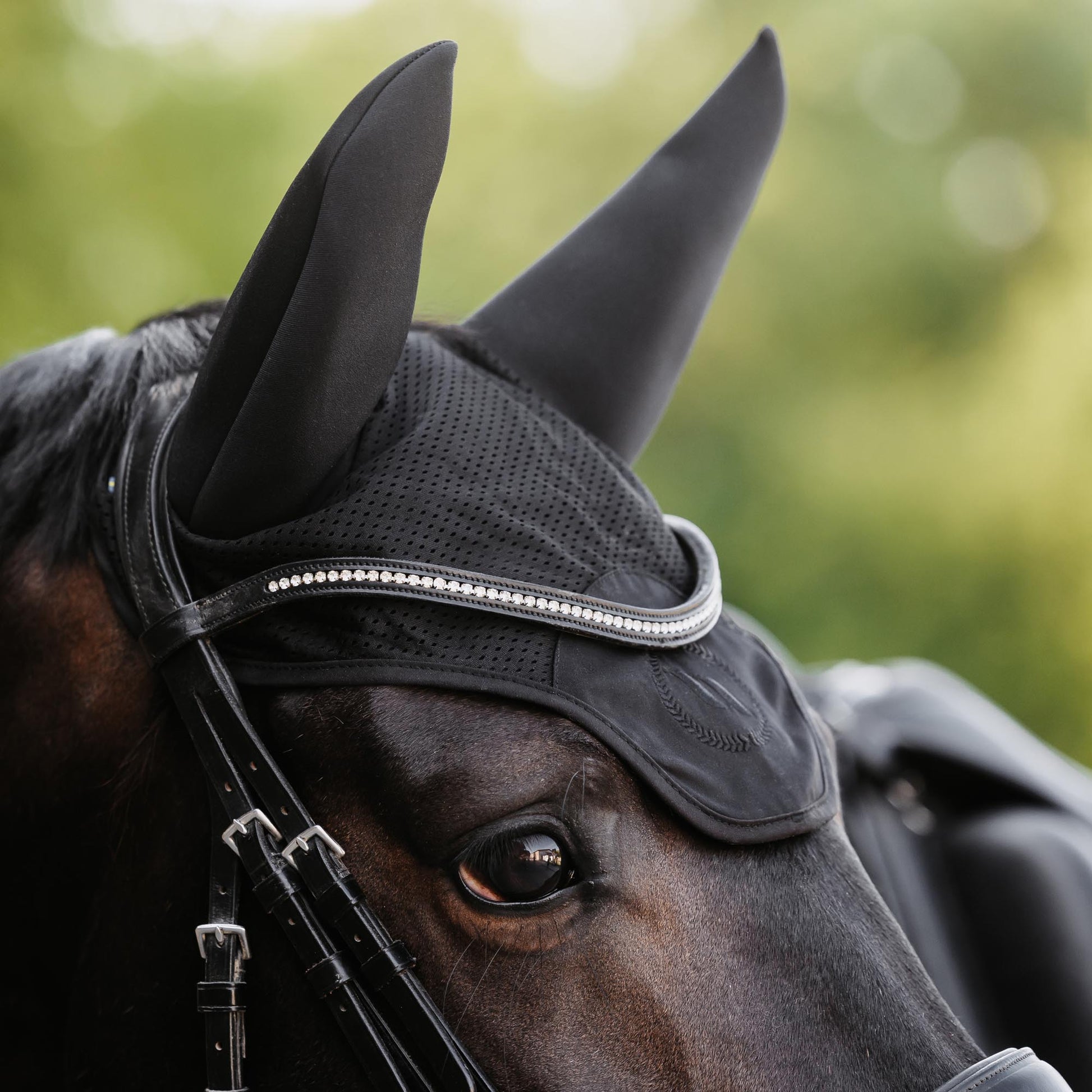Ljuddämpande hästhuva som kan verka lugnande på en spänd häst genom att utestänga distraherande ljud och skydda öronen från blåst och insekter.