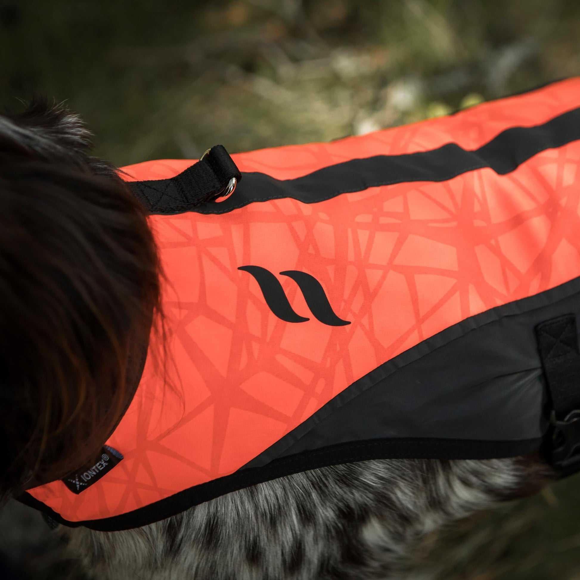 TRAKK är ett orange signaltäcke avsedd för arbetande hundar. Den klara och livliga färgen tillsammans med ett reflexmönster i materialet maximerar synligheten både i skog och mark samt under svaga ljusförhållanden.