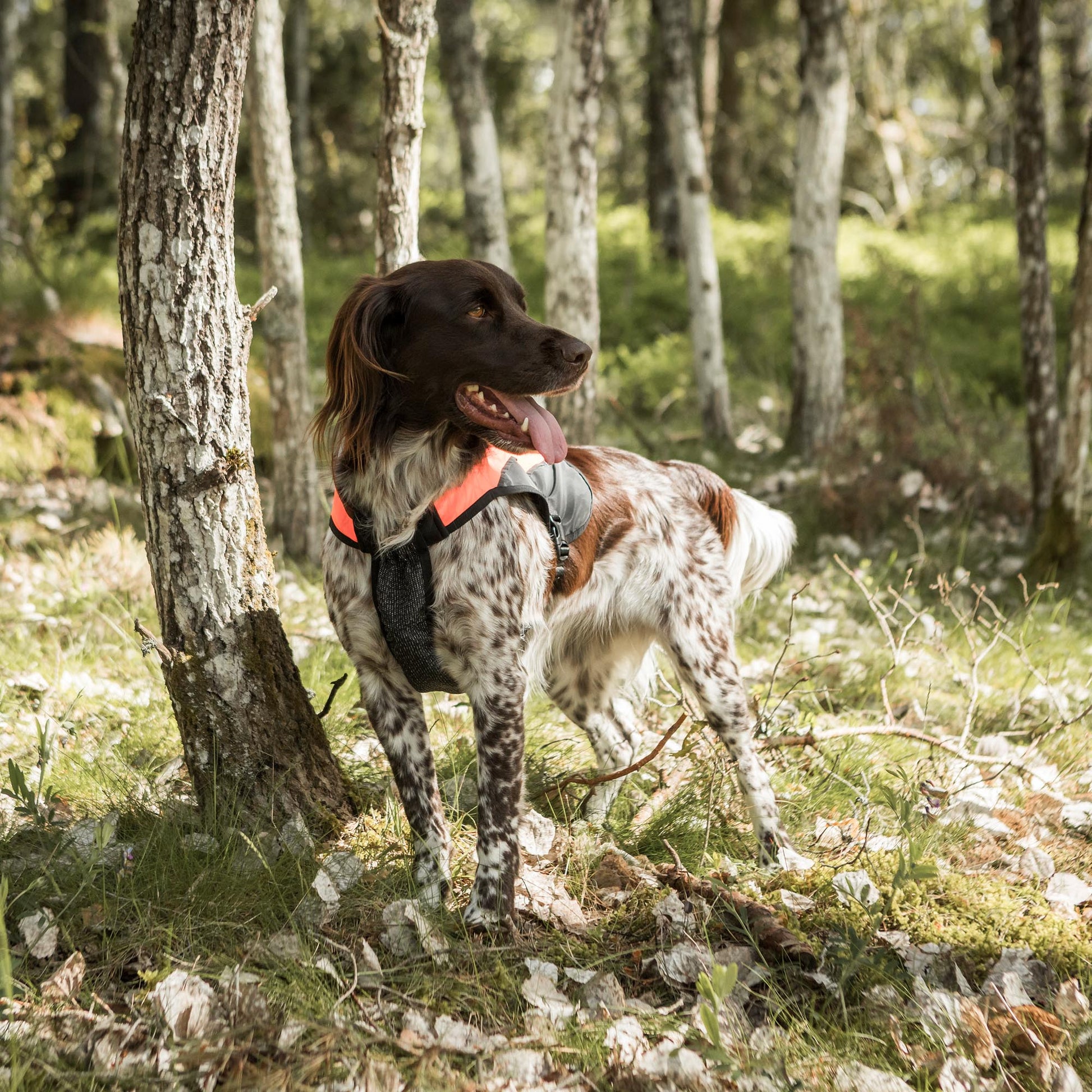 En förstärkt, elastisk bröstplatta skyddar hundens bröst och mage mot stick och skador från exempelvis grenar och andra skarpa föremål i undervegetationen.