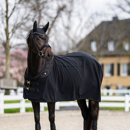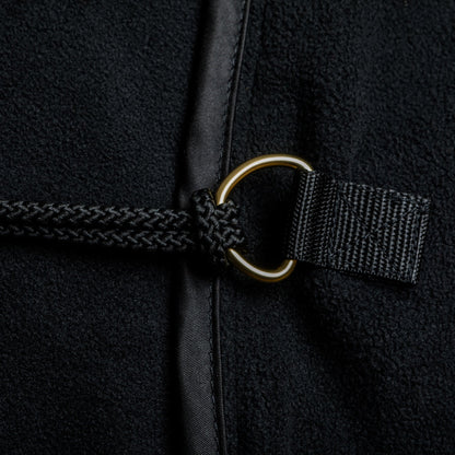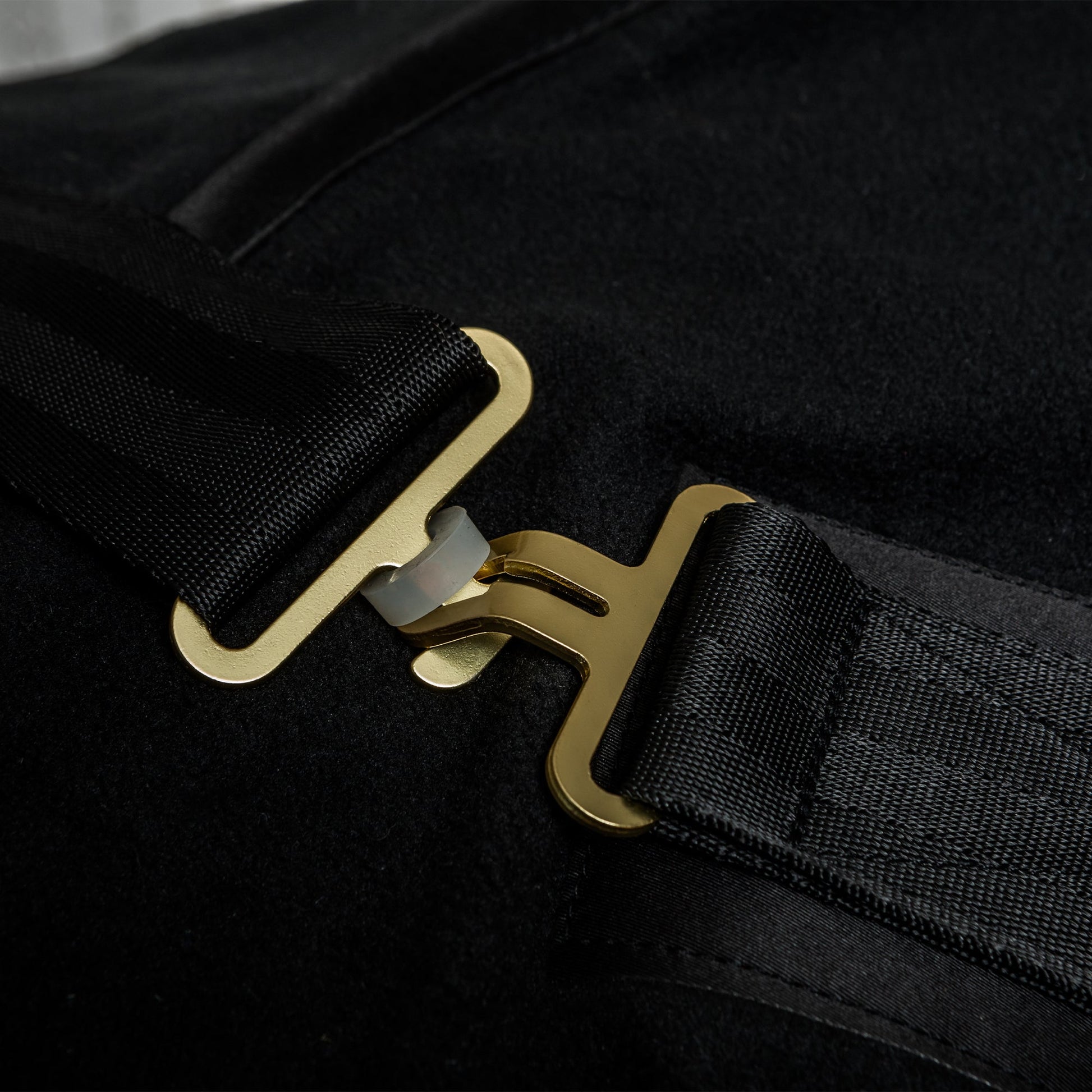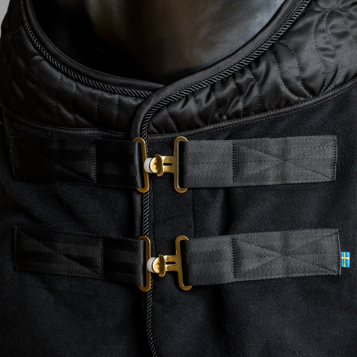 Tæppet holdes på plads med aftagelige stropper og lukkes foran med to T-spænder. D-ringe til halesnor.