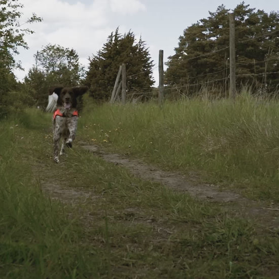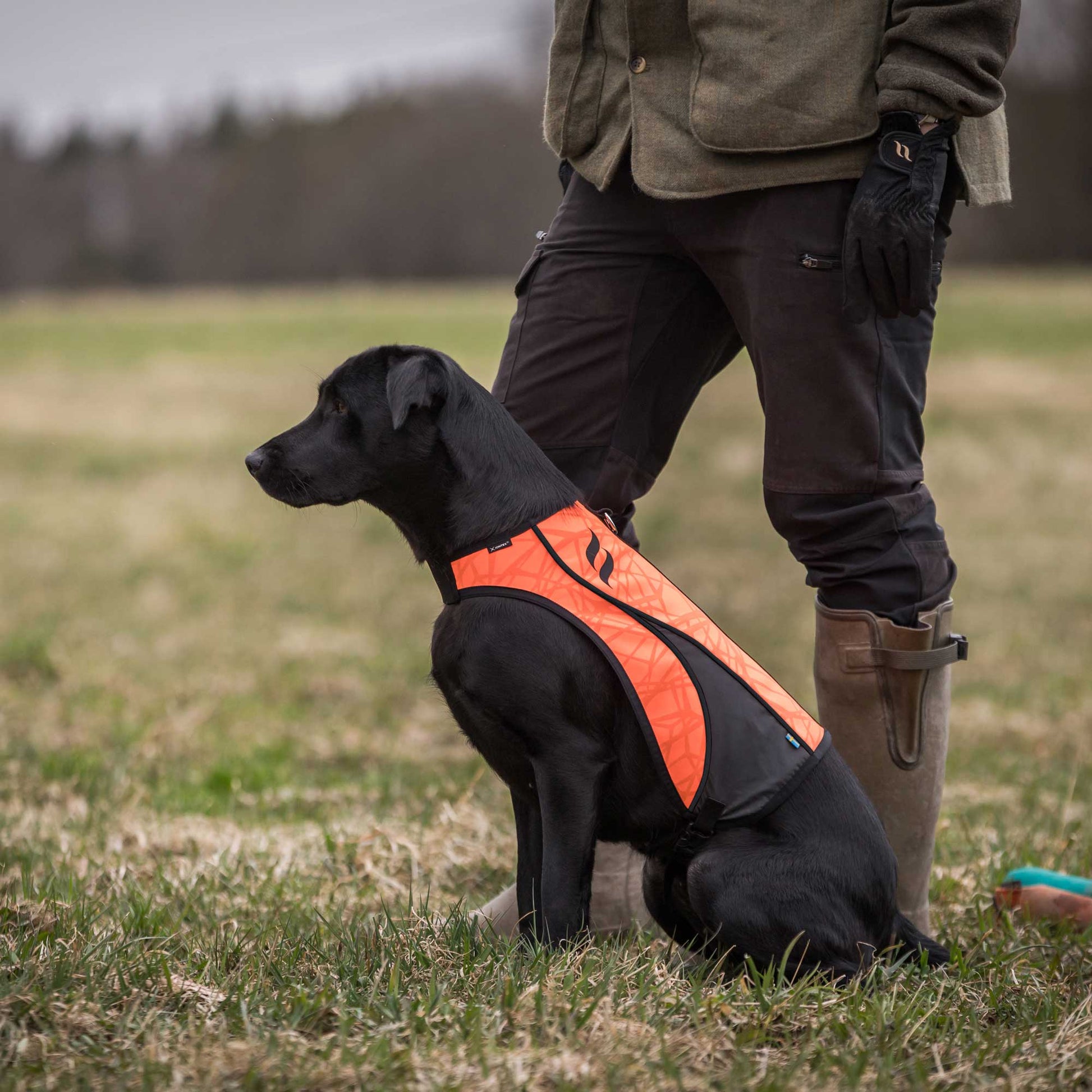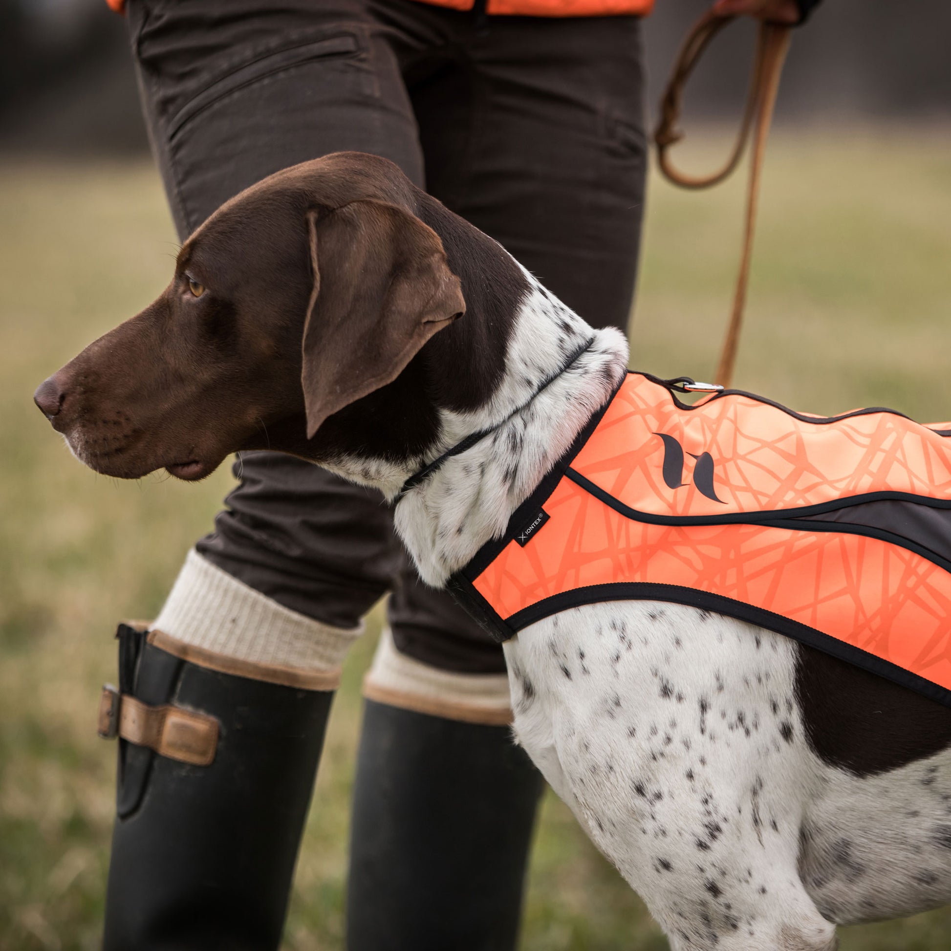 POINT er en orange signalvest beregnet til arbejdshunde. Den klare og livlige farve sammen me det reflekterende mønster i materialet maksimerer synligheden både i skoven og på jorden og i svagt lys.