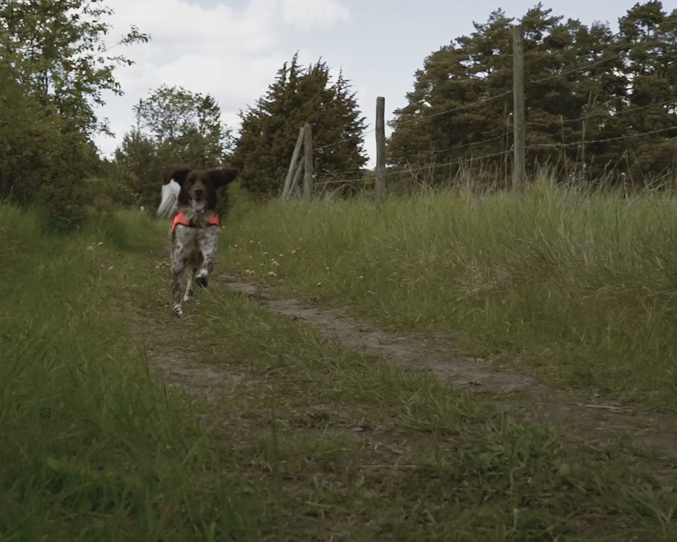 Det sorte motiv står tydeligt i kontrast til den orange bundfarve og angiver hundens retning og position, hvilket er særligt nyttigt til pointere under fuglejagt.