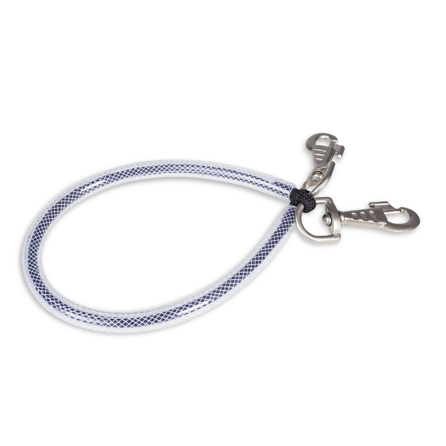 Snoren er sort med et sølvfarvet karabinhagespænde i hver ende til fastgørelse på et dækken. Samlet længde: 55 cm